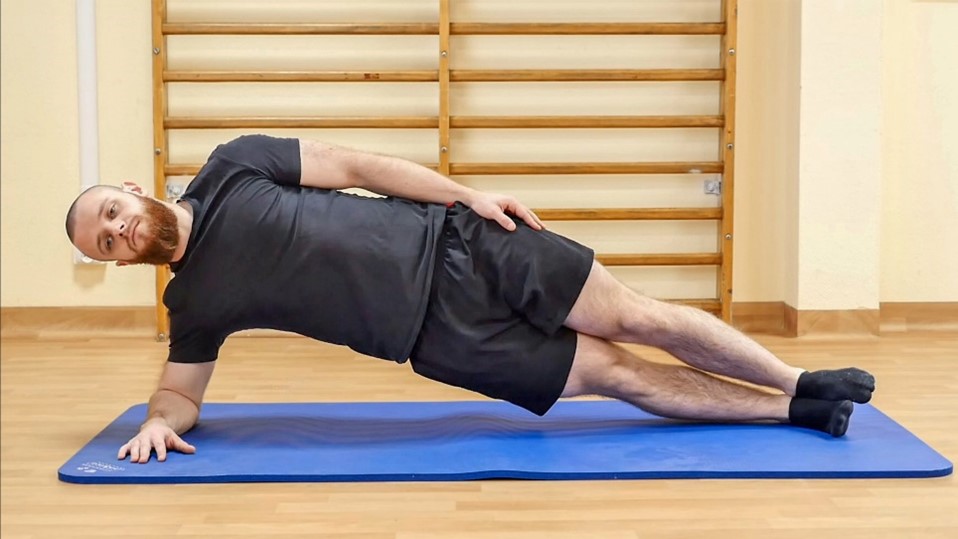 - La prueba de resistencia lateral del tronco mide la resistencia de los músculos laterales, incluidos el transverso del abdomen, los oblicuos, el cuadrado lumbar y el erector de la columna. Esta prueba cronometrada implica contracciones estáticas e isométricas de los músculos laterales de ambos lados del torso para estabilizar la columna. La prueba se realiza con el participante acostado de lado, levantando la cadera y apoyando el peso del cuerpo en el codo y los pies. Esta prueba se realiza para ambos lados del cuerpo (foto 2).