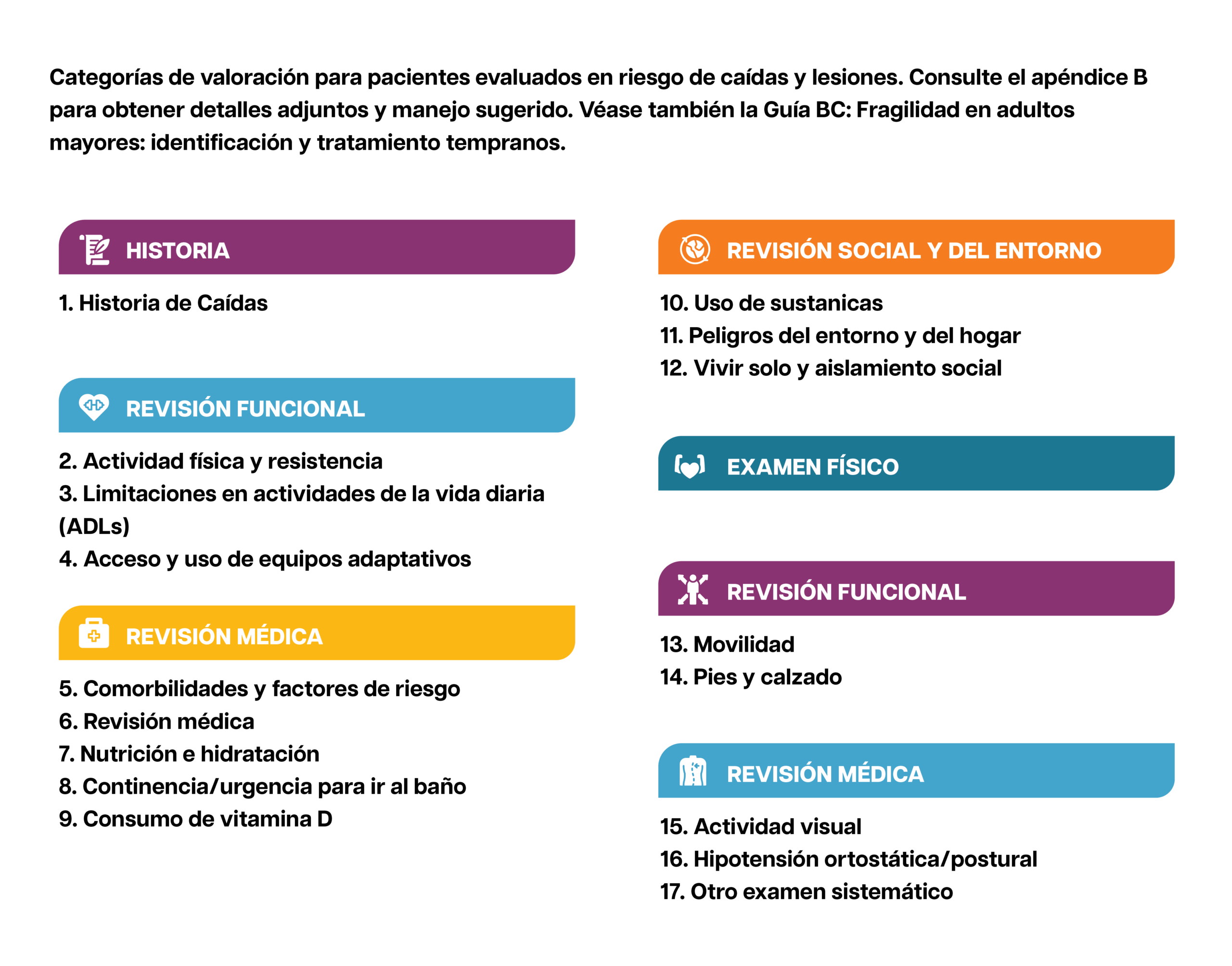 Al estimar el riesgo de caída, vale la pena tener en cuenta la edad y las características personales del paciente, registrando información sobre caídas/historiales anteriores, hábitos de medicación, otras condiciones médicas, habilidades de equilibrio, nivel de actividad, habilidades físicas y de coordinación, reactividad, sensoriales. (especialmente visual) e incluso función cognitiva si es posible.