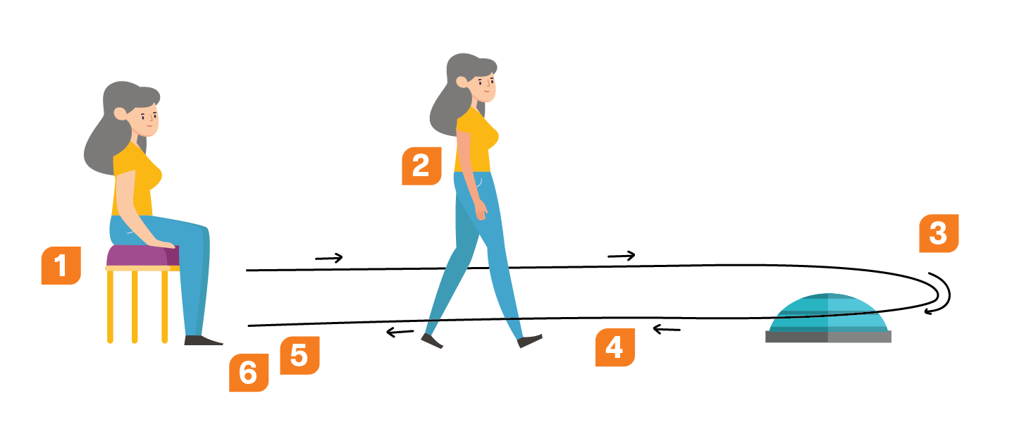 Prueba Time Up and Go: La prueba Timed Up and Go (TUG) se puede utilizar para evaluar el rendimiento físico. Es la medida del tiempo que tarda la persona mayor en levantarse a la orden de inicio del fisioterapeuta mientras está sentada en una silla, caminar alrededor de un punto a 3 metros de distancia y volver a sentarse en la silla. Más de 15 segundos es indicador de riesgo de caída. La prueba TUG es un fuerte predictor de mortalidad, desplazando a otros factores de riesgo establecidos, como las enfermedades crónicas, en poblaciones geriátricas de países de ingresos bajos y medios.