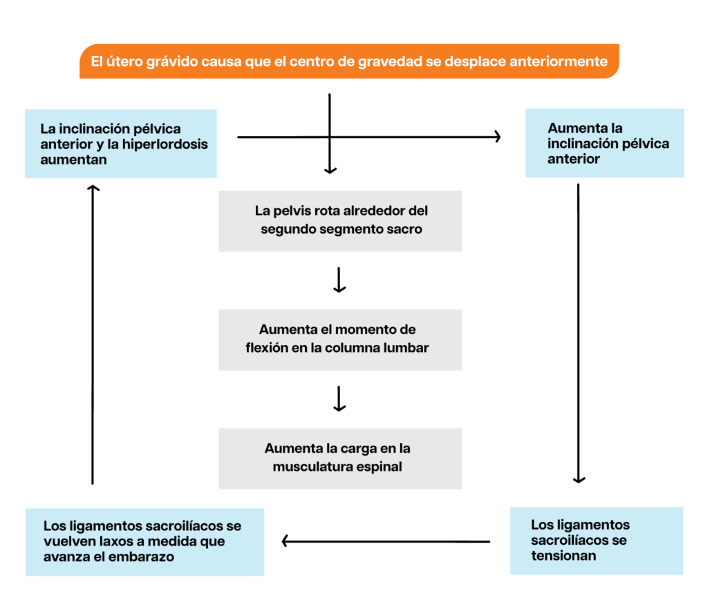 • El embarazo induce importantes cambios fisiológicos en el cuerpo de la mujer, que afectan no sólo a los sistemas cardiovascular, endocrino y renal, sino también al sistema musculoesquelético, con especial énfasis en el esqueleto axial. Este fenómeno está marcado por distintas fluctuaciones hormonales, junto con un aumento de la masa corporal y la presencia del útero grávido, que culmina en un desplazamiento del centro de gravedad. En consecuencia, se imponen cargas estáticas y dinámicas adicionales sobre el esqueleto axial.[6].